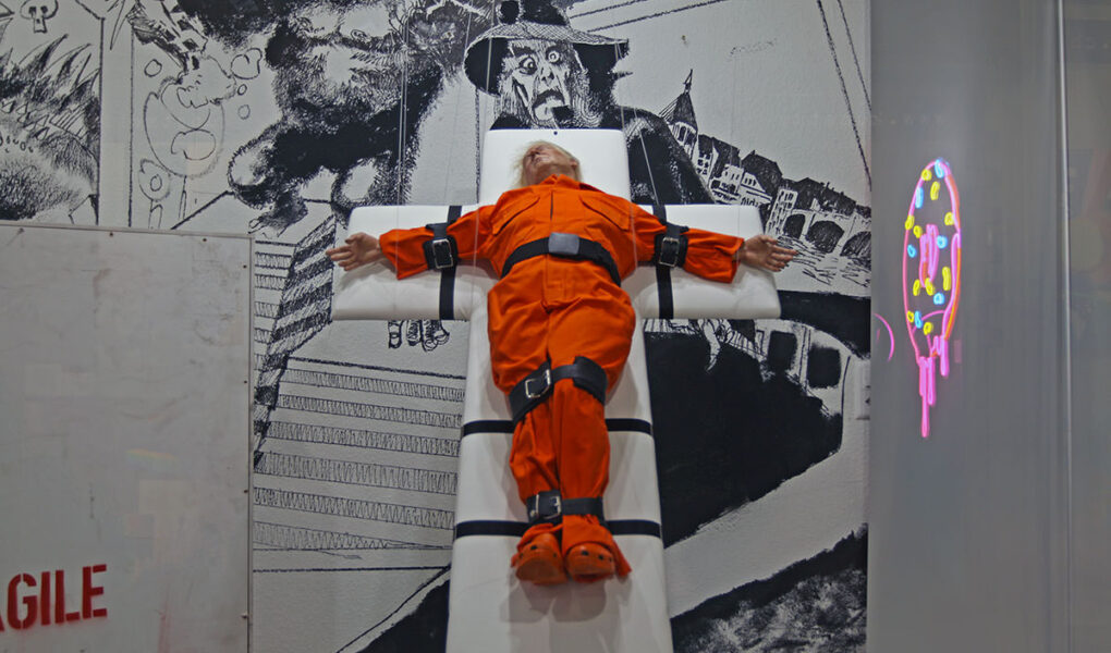 The controversial British artist Mason Storm dressed Donald Trump in a prison jumpsuit and strapped him on a cross. He has a BuzzFeed-style quiz question for you: Saint or sinner?