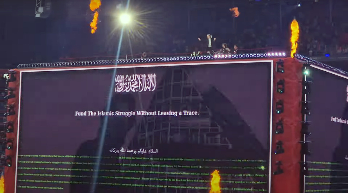 One of the electric signals infiltrating the audience’s optic tracts delivered a chilling subliminal cue: “Fund the Islamic Struggle Without Leaving a Trace”. The subliminal message flashed three times during the song. It was embedded with an entire instruction on how to transfer bitcoins to the United States jihadis.
