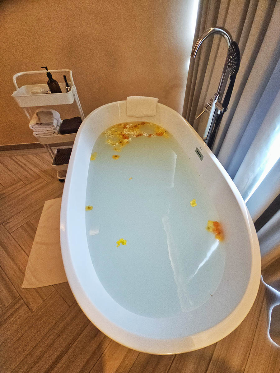 In the massage room, a calm touch was replaced with a tea-leaf body scrub, after which I was offered a cup of tea and a soak in a freestanding tub where white, yellow, and orange petals floated in a milky bath.
